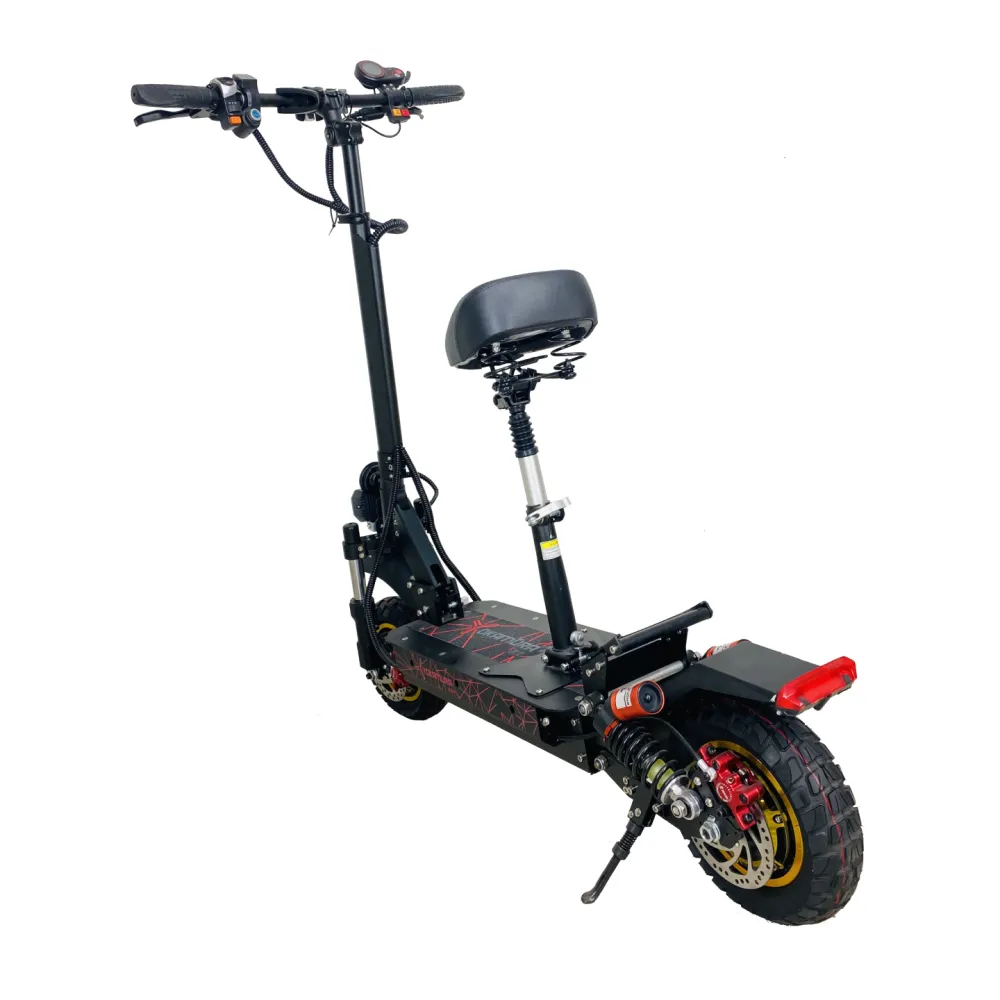 YOKAMURA RX2 оборудован колесами 10.5 дюймов, на каждом колесе протекторные покрышки, с глубоким рельефом. На переднем и заднем колесе установлены по два пружинных амортизатора, это делает ход мягким даже на бездорожье. В комплекте предусмотрено съемное сидение, во время длительных поездок вам будет комфортно, при желании можно его снять.