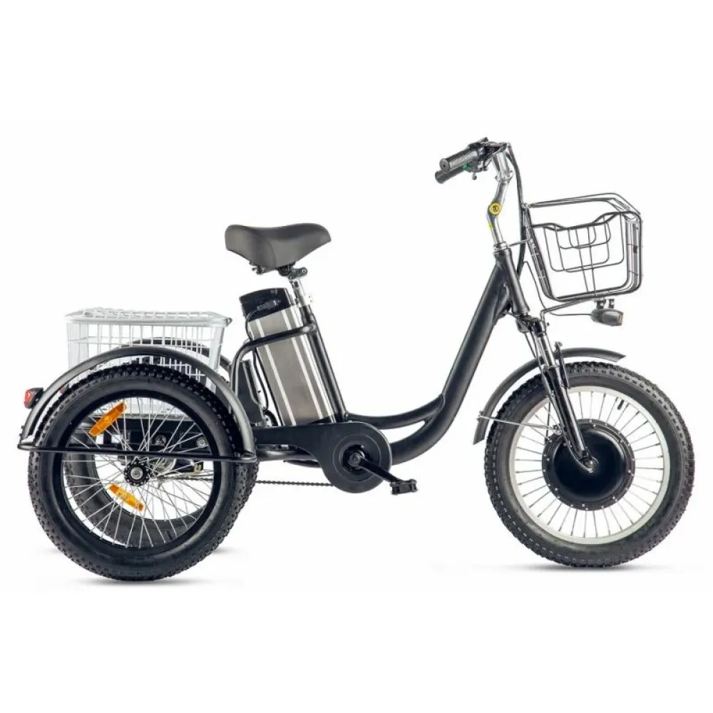 Покупка техники обещает эмоциональное удовольствие и помощь при транспортировки тяжелых предметов. При максимальной грузоподъемности 120 кг электровелосипед со скоростью 30 км/час без труда преодолевает 70 км пути. Указанный показатель максимальный среди трициклов.